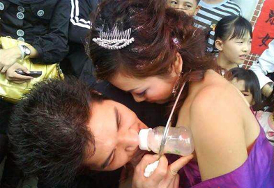 3、香唇探宝 新郎平躺在4把椅子上,弟兄们在旁边围着看,新郎身上放上8-10个小物件,可以是小糖果,牛肉干之类,新娘蒙上眼睛转个圈然后不用手要用“香唇”把新郎身上的小物件收集齐全然后拆去眼布一个一个喂给新郎吃。提示:新郎可以对新娘说,指挥她 |